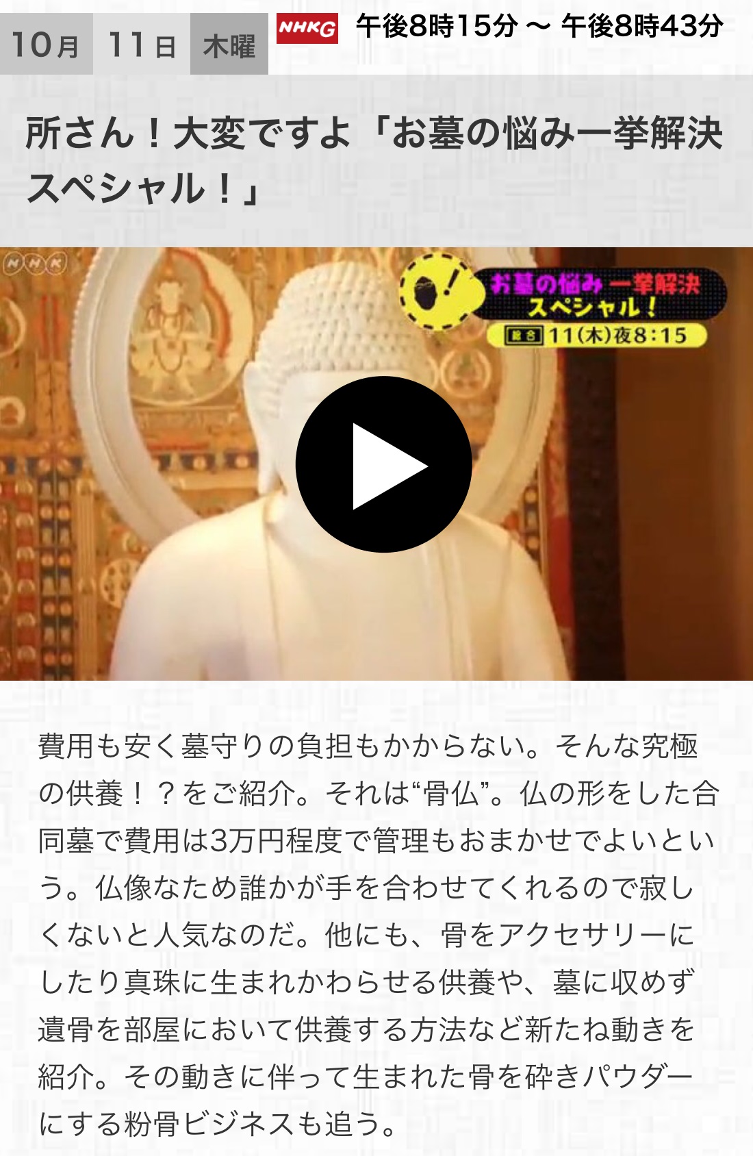 他にも、骨をアクセサリーにしたり真珠に生まれかわらせる供養や、墓に収めず遺骨を部屋において供養する方法など新たね動きを紹介。その動きに伴って生まれた骨を砕きパウダーにする粉骨ビジネスも追う。
