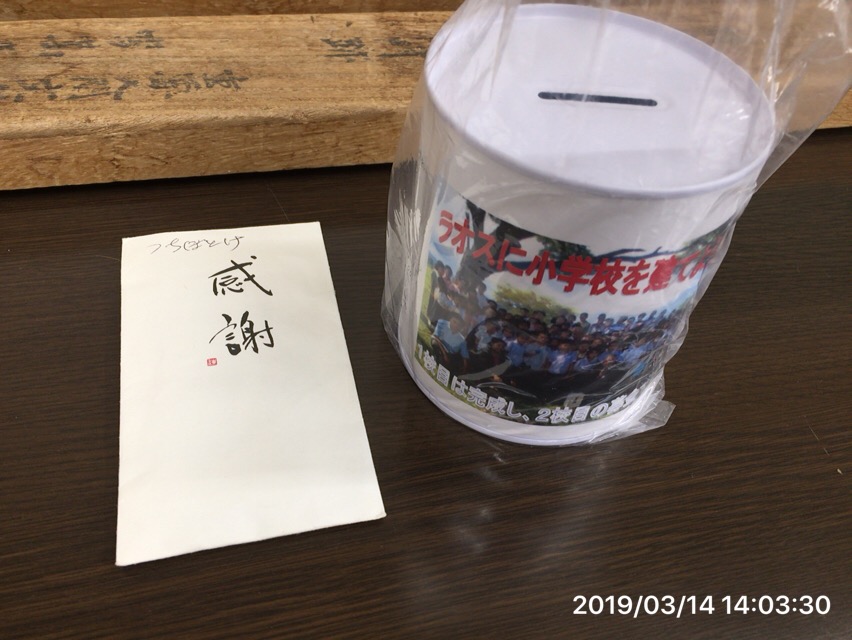 生徒さんの作ったつちぼとけを差し上げたところ、寄付をいただいたとラオス小学校募金にお持ちくださいました。
