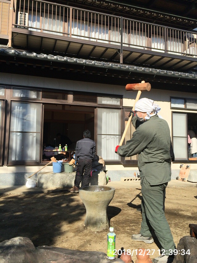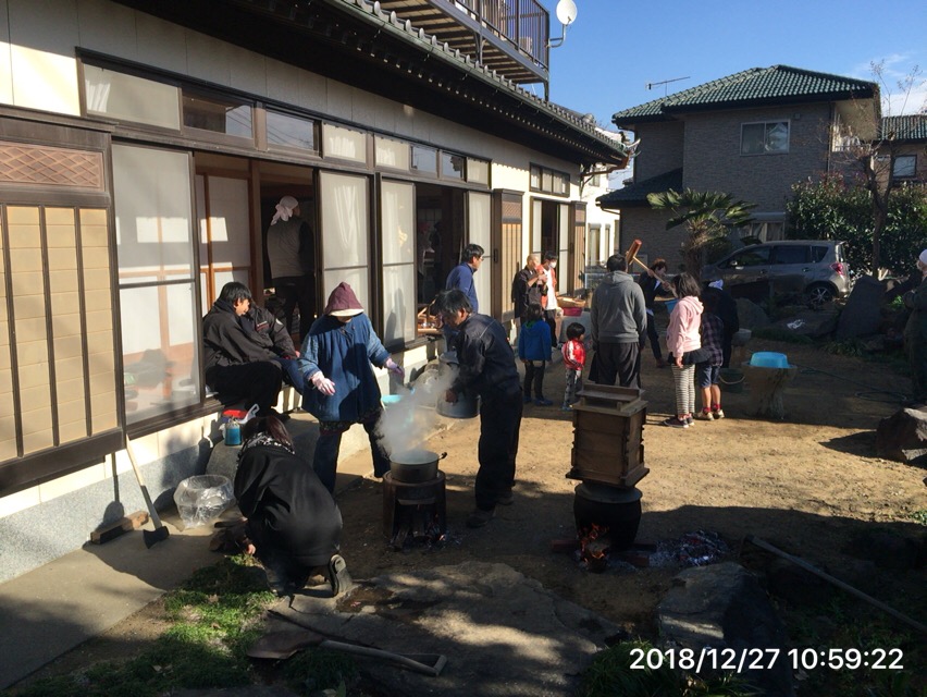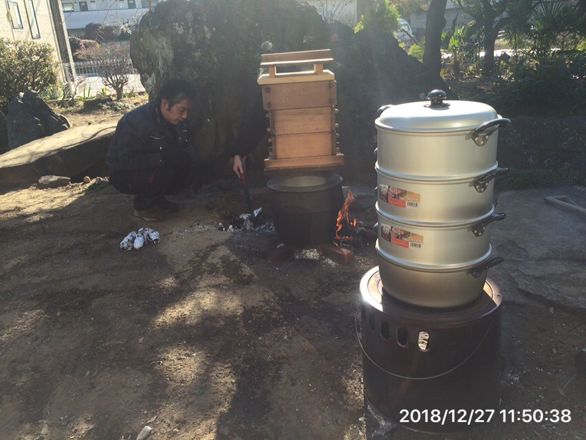 餅つきって大変です。もち米は宮崎県 都城市より届き餅を蒸かすためのせいろの薪は八王子から。