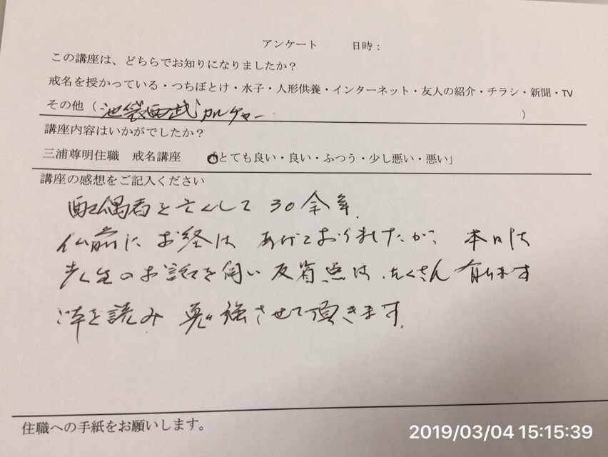 平成31年3月4日 今日は池袋西武百貨店 戒名講座です。