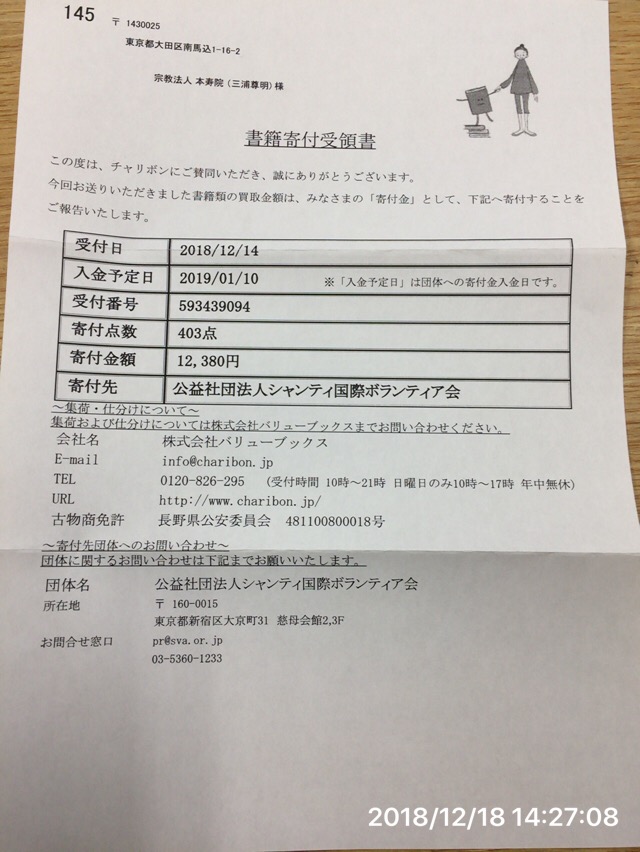 本を寄付させていただきました 2018 12/19 ボランティア ラオスに学校を建てよう 2018-12-19 当院でお預かりしました、本類を公益社団法人 シャンティ国際ボランティア会へ寄付させていただきました。 403点 12,380円 ありがとうございました。 ボランティア ラオスに学校を建てよう よかったらシェアしてね! URLをコピーしました! URLをコピーしました! 北千住つちぼとけ教室30年12月 横浜そごうつちぼとけ教室30年12月 この記事を書いた人 本寿院 住職 本寿院住職 三浦 尊明 比叡山高校卒業 大正大学仏教学部卒業 平成8年 円宗院 平成14年 本寿院住職となり現在に至る。 読売文化センター講師 NHKカルチャー講師 NPO法人かけこみ相談センター理事長 NPO法人日本投扇興保存振興会理事長 ◆つちぼとけ(陶芸で仏像を造る)を通じた仏教活動を全国各地で開催している。 関連記事 3000体のご縁をプレゼント 2025-10-30 ラオス小学校建設募金|本寿院に届いた心温まるお手紙とご支援 2025-10-28 第2回本寿院チャリティつちぼとけ展 2025-09-19 ラオス小学校報告2025/09 2025-09-11 第9回つちぼとけ展最終日 2023-11-29 ラオスカムポーン小学校報告会 2023-09-04 ラオス小学校報告会 2023-08-08 ラオスカンポーン小学校年次報告 2022-11-14 コメント コメントするコメント ※ 名前 メール サイト