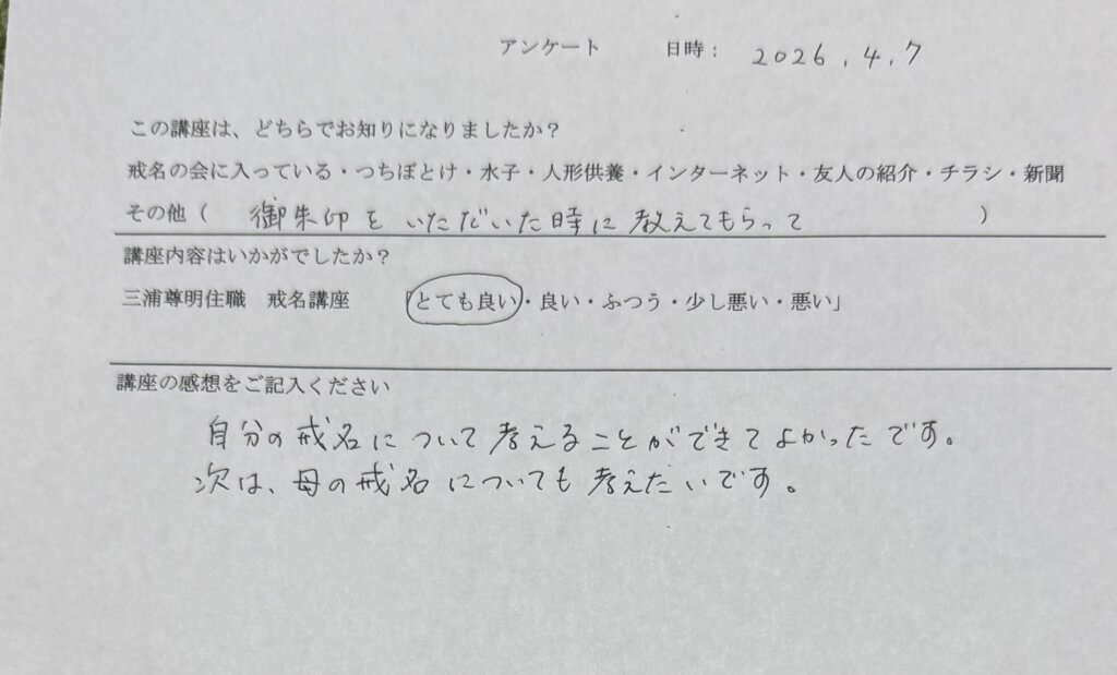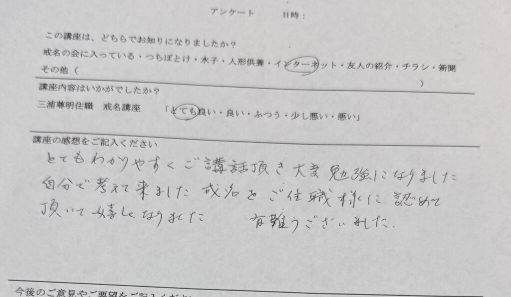 生前にお墓を建立し、後は知らないお坊さんに戒名を付けてもらいたくないので、受講された方など