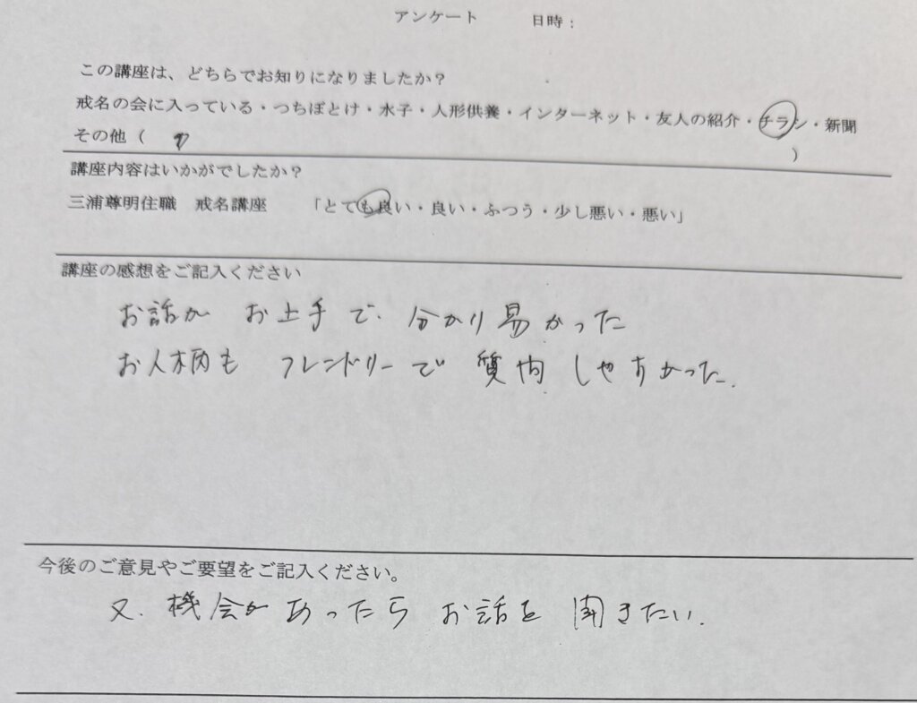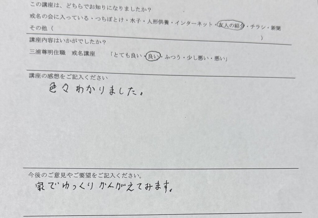 戒名の事を知ると、今まで考えもしなかった事が理解でき、すべての悩みが解決します。受講前は、戒名料の不満や批判的な方が多かったのですが、理解をすれば、それは別の見方に変わってまいります。