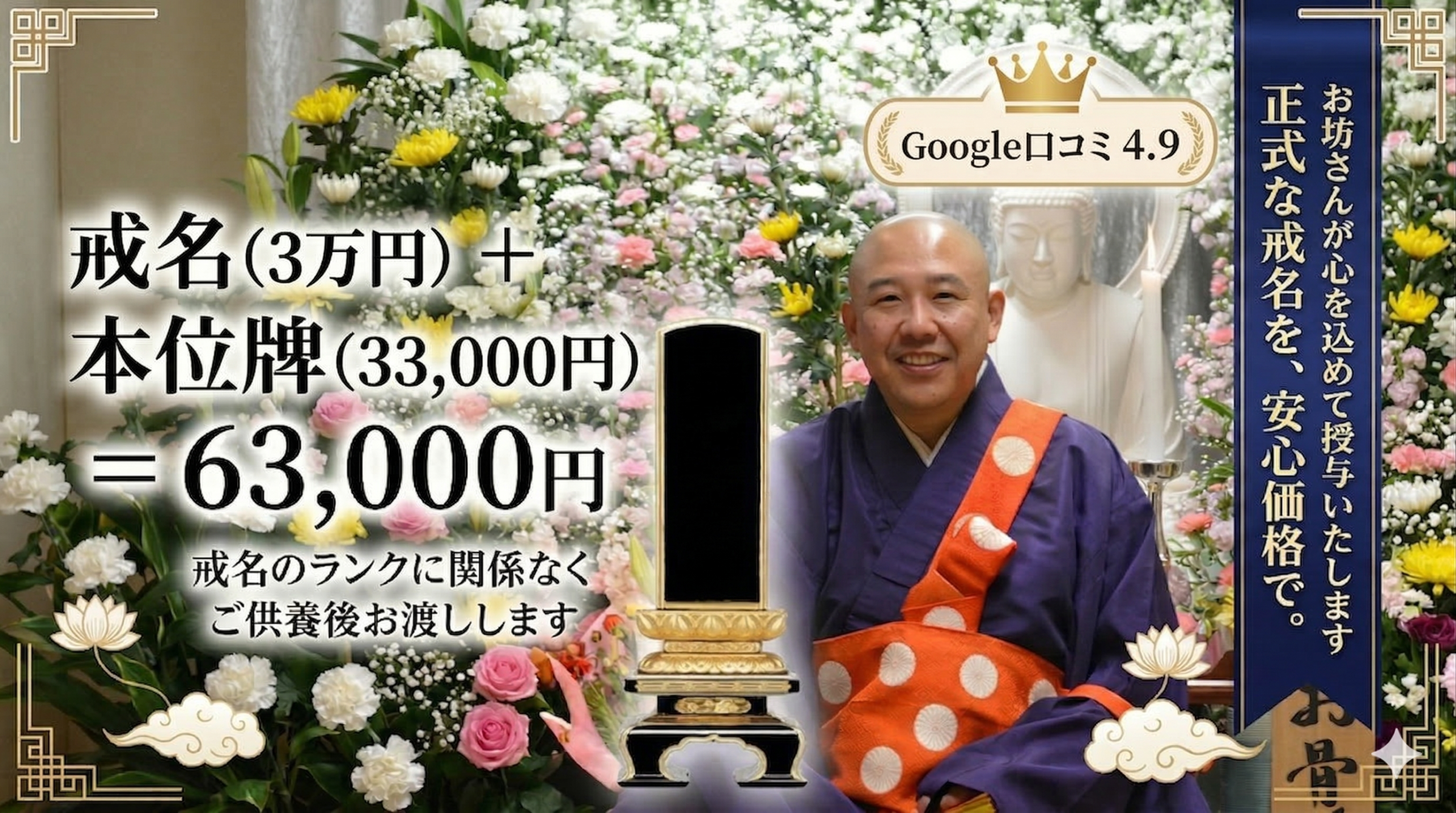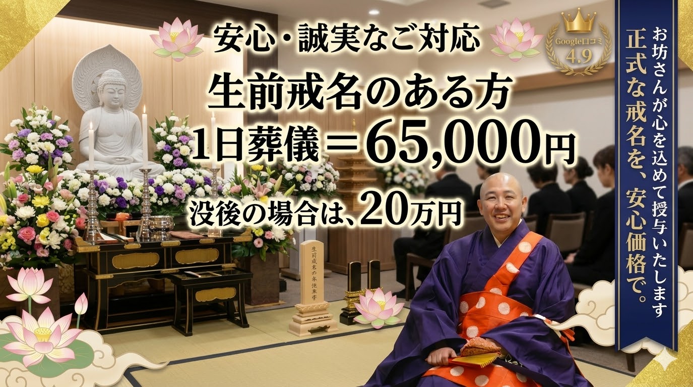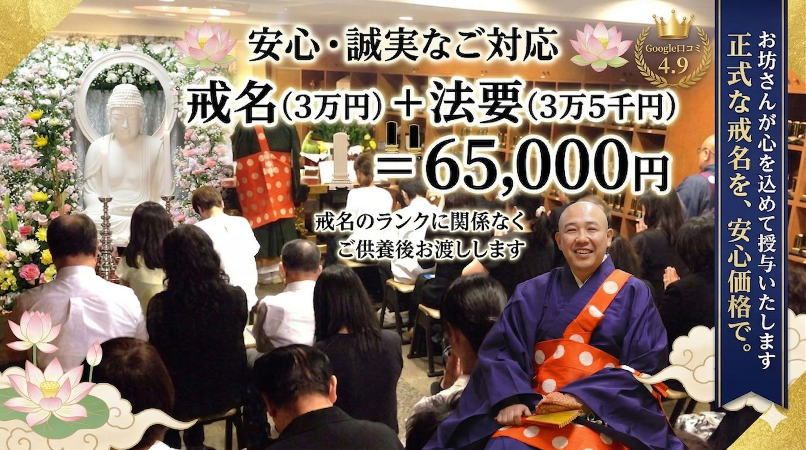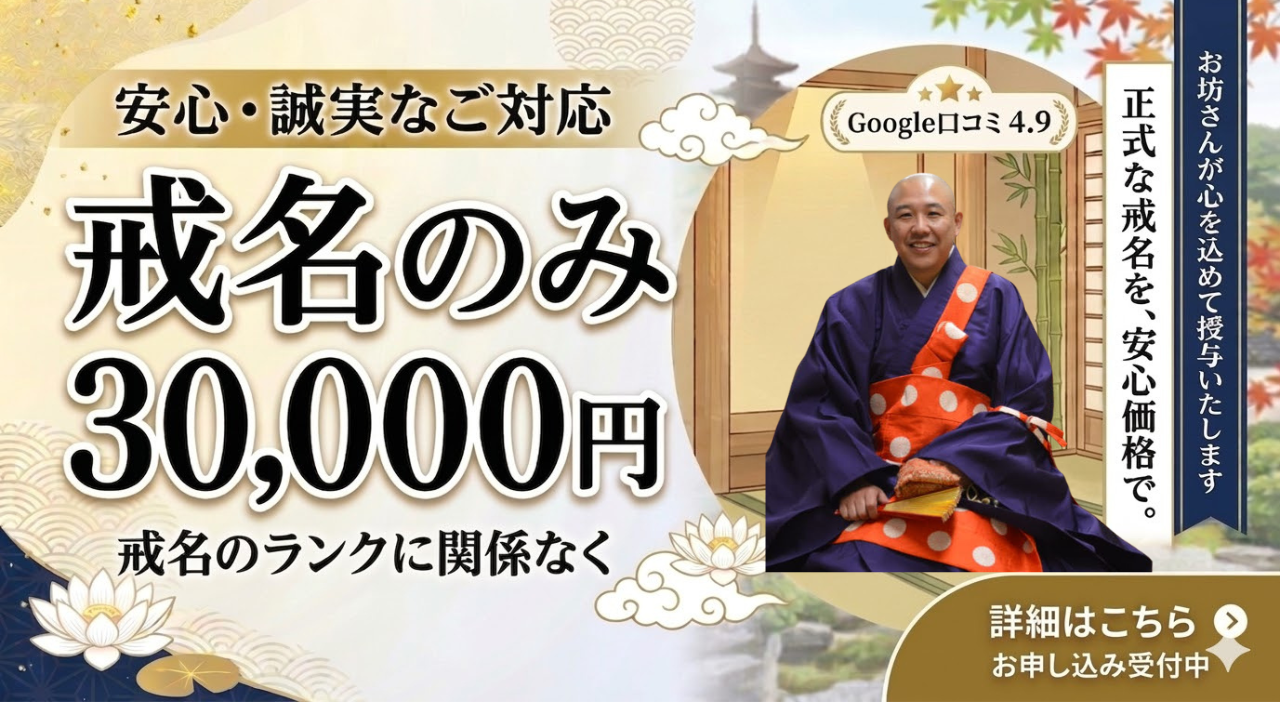 通常数十万といわれる戒名料が、3万円で授かる事が出来るのはおかしい。かえって心配とのご意見も頂戴しております。戒名とは何か?お布施とは何か?Q&AやYouTubeや戒名講座で詳しくお話ししておりますのでよろしければご覧ください。Googleの口コミにもたくさんコメントや4.9という高評価をいただいております。