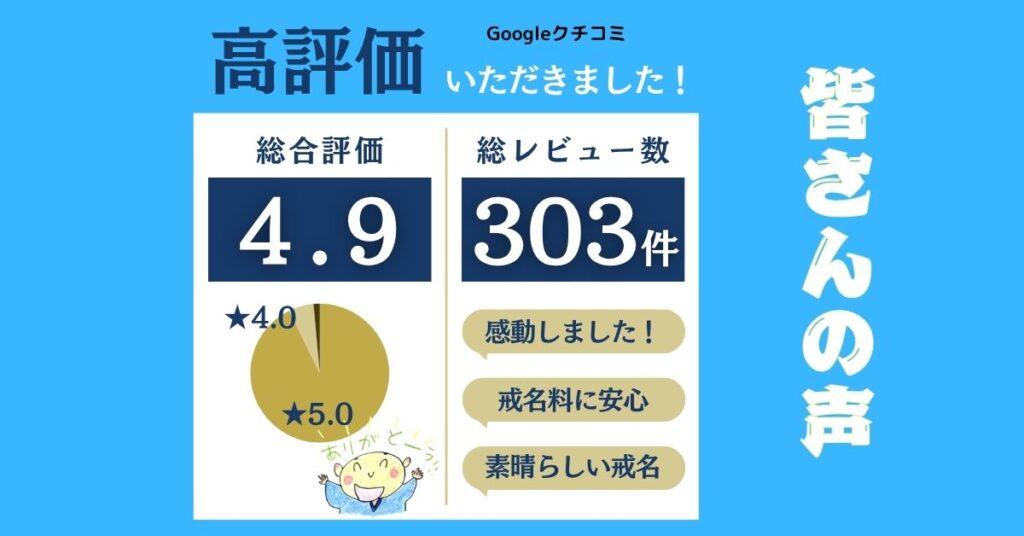 通常数十万といわれる戒名料が、3万円で授かる事が出来るのはおかしい。かえって心配とのご意見も頂戴しております。戒名とは何か?お布施とは何か?Q&AやYouTubeや戒名講座で詳しくお話ししておりますのでよろしければご覧ください。Googleの口コミにもたくさんコメントや4.9という高評価をいただいております。