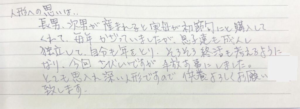 ※お布施につきましては、下記の【人形供養 遺品供養 思い出の品供養「お布施」について】を ご参照下さい。