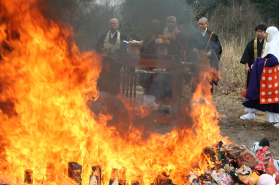 お焚きあげは、消防署に届け出る事から始まります。また、僧侶だけでなく、消火のためのスタッフも随行します。