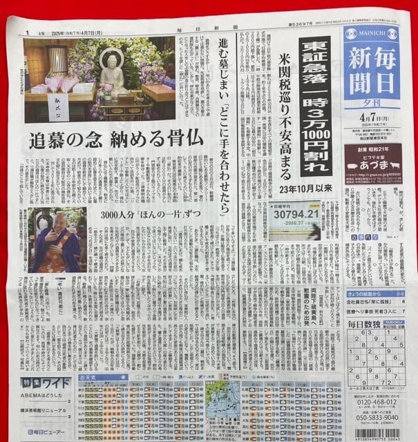 2025.3.20 お骨仏様の花法要を厳修いたしました。毎日新聞一面にも紹介されました。