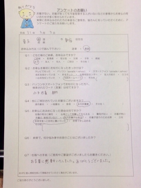 電話での対応も知らないことも教えていただきありがとうございます。 亡くなった夫も落ち着くことも出来ます。宜しくお願い致します。